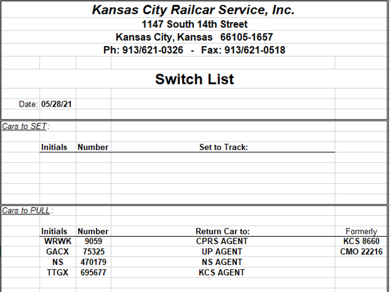 Dane with KC Rail will send his outbound switch along with BOLs he's submitted for cars leaving his shop. When we receive this the following steps should be followed.