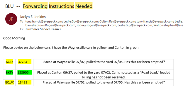 Evergreen has two facilities, Waynesville and Canton. These facilities will ship cars back and forth to each other. When an Evergreen car No Bills, there is a specific way they need to be emailed.