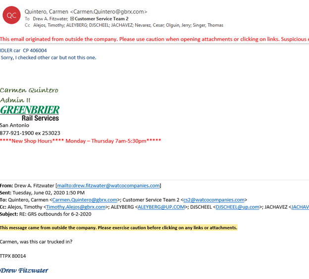 Greenbriar repairs and scraps cars at their facility. From time to time there will be a GBW car on the outbound that is not online. When that happens, you will need to email our GBW contacts in Wiki and ask if the car was trucked in or brought in on a hospital car.