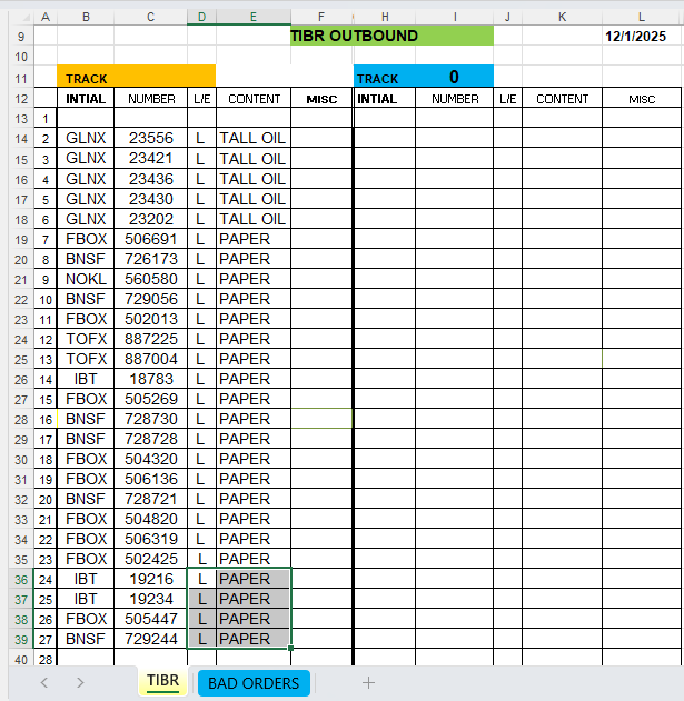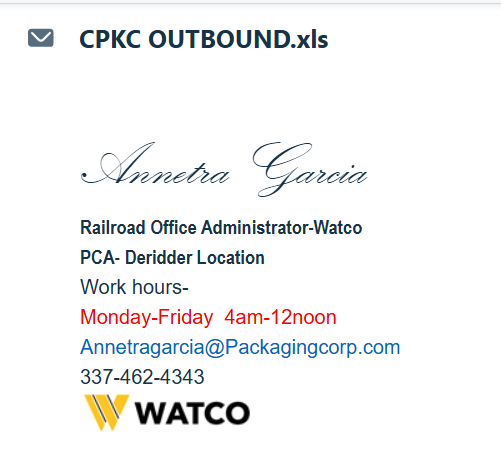Open the attachment; there are ONLY two tabs now as we no longer interchange with the CPKC. You will receive a separate email for the cars going out BNSF that were brought to the plant from the CPKC.