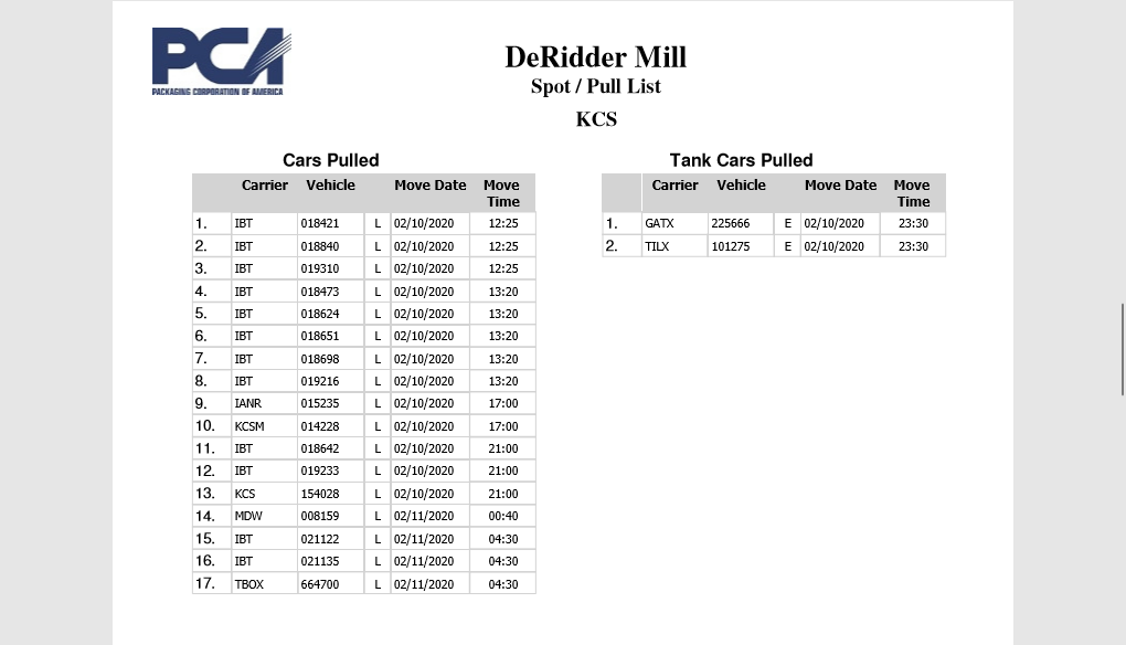 This page will have all the cars PCA is billing out to leave with the KCS. Tank cars will not usually be billed out until after 10:00am.
