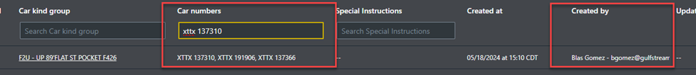 At the bottom, move your slide over all the way to the right. At the top you will see “Car numbers” and who the car order was “Created by”. If the car has been assigned to the car order, you can search for the car and it will let you know which car order it is on and who created it. XTTX 137310 is on a car order, created by Blas Gomez at Gulfstream: