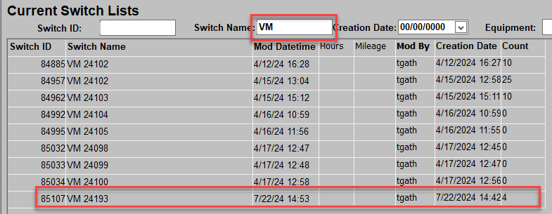 3. Once you are showing good billing in ARMS, go into Watss and find your switchlist that had been created when the cars were loaded by searching VM in the switchlist Switch Name (helpful hint: type VM in the Switch Name). Once found, open your switchlist: