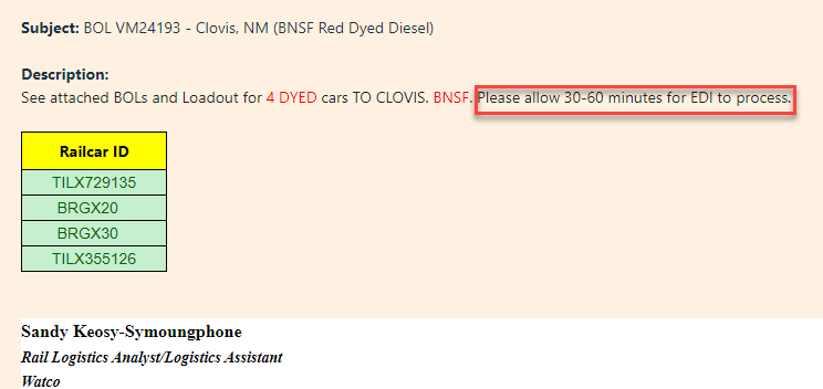 2. Once the cars have been billed by Rail Logistics, they will send in an email with the BOLs, responding to Valero that the cars have been billed. It may take up to 60 minutes for the cars to show as billed in ARMS.