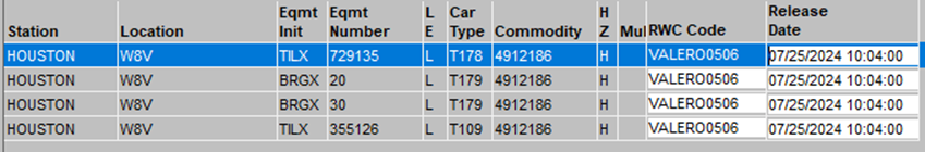 2. Highlight your cars and hit the L/E button. Right click in the RWC Code field. Locate your RWC to load the cars with using your drop downs. RWC Type is a Online/Local and your L/E status will be L. You then need to refer back to your email and determine what the commodity is that was loaded and select the RWC accordingly: