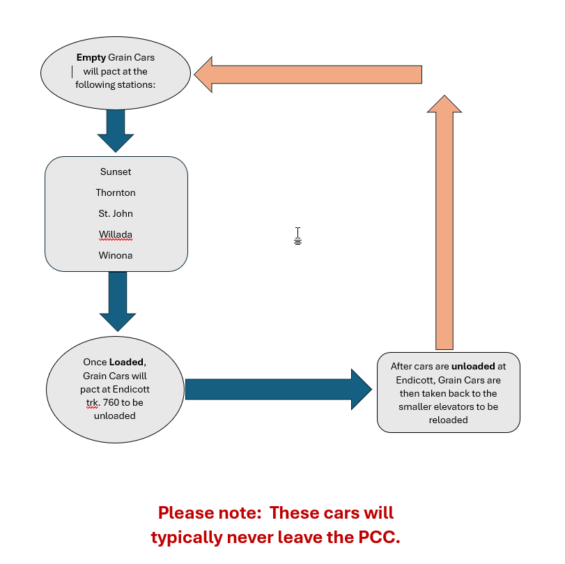The PCC Grain Cars are usually moved as local moves. We have numerous Stations on the PCC that have smaller grain elevators that empty cars are spotted for Northwest Grain. Once they are loaded, they will then move to Endicott, trk 760 to be unloaded. After they are unloaded, they will return, as empties, to the smaller grain elevators to be reloaded. The process will start over again. It is important that we make sure that the load/empty status is correct on the cars, as they move. I have provided a flow chart at then end of this process.