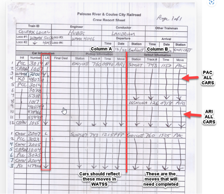 - After Pick Up Information and l/e status has been confirmed, you may then proceed to move the cars according to the Setout Information. Please note that the arrows simply mean that they same Setout Information is used for those cars. Ops with give you more information in the Setout Information if it changes. See below: