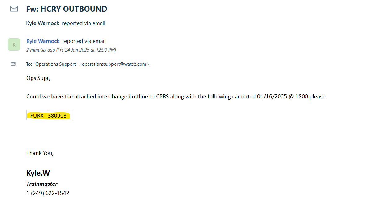 This will open up all the emails he has previously sent. You can then click on the last email sent to see what railroad was designated to him. In this case, it is the ACR.